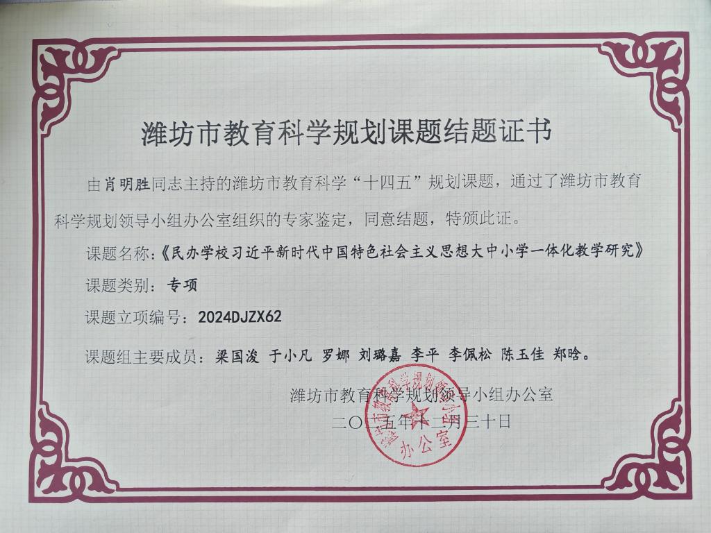 近日,由我校党委书记肖明胜主持的潍坊市教育科学“十四五”规划专项课题《民办学校习近平新时代中国特色社会主义思想大中小学一体化教学研究》顺利通过潍坊市教育科学规划领导小组办公室组织的专家鉴定,正式结题。